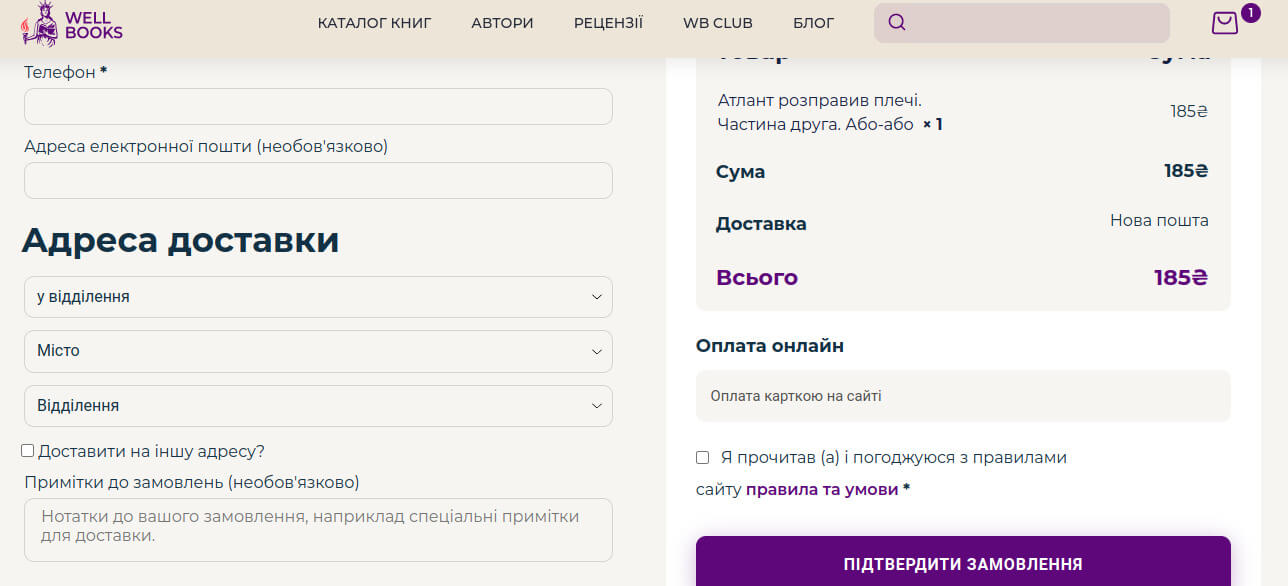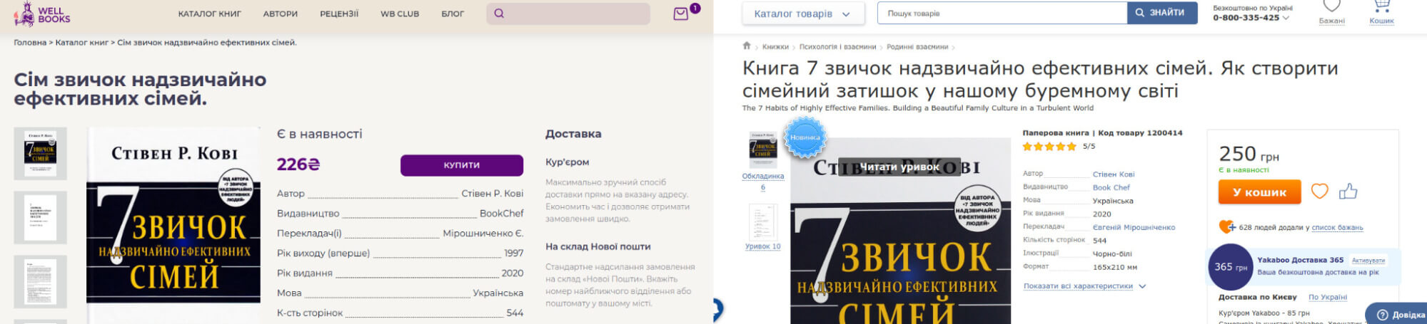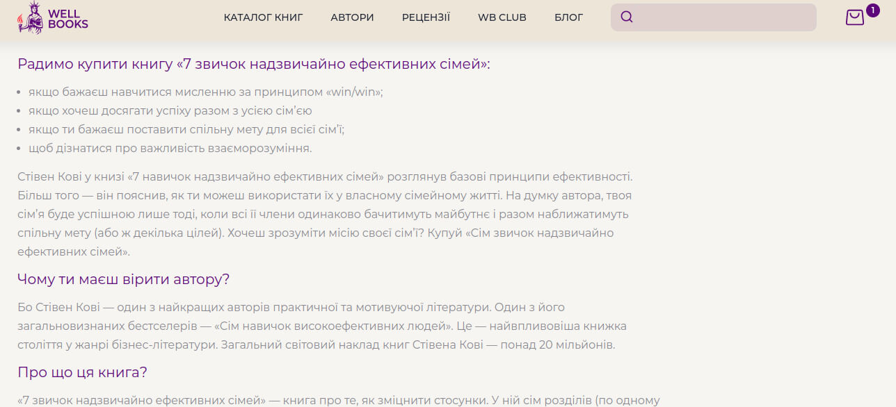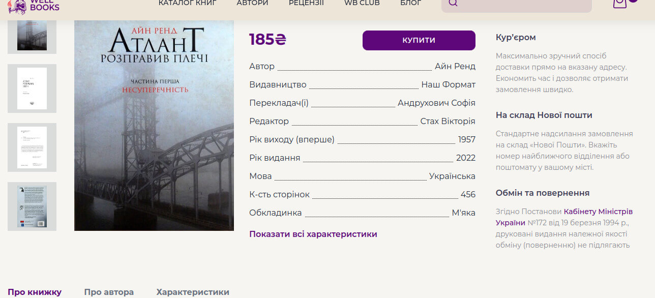 Товарні сторінки теж справляють приємне враження: коротка інформація про книгу, детальний опис, дані про доставку та оплату. Є все для ознайомлення, і додаткових питань не виникає.