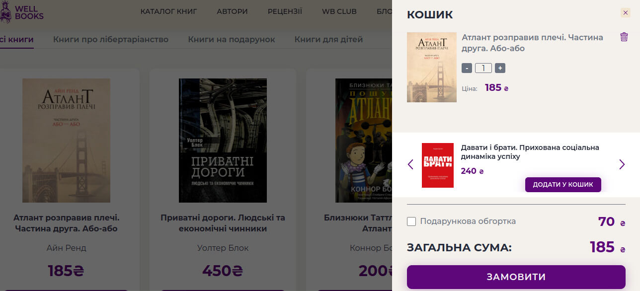 Принцип замовлення сподобався. При додаванні книги до кошика з’являється бічне меню. Можна відразу оформити покупку, подивитися додаткову рекомендовану книгу (та додати її). Зручна опція — подарункове пакування. Таким чином розробники сайту врахували побажання значної частини цільової аудиторії: тих, хто купують бізнес-літературу в якості презентів для керівників, колег, партнерів.